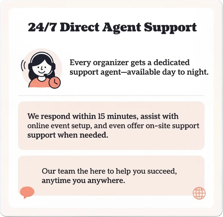 Enjoy true peace of mind with round-the-clock, dedicated assistance from our expert team. Every organizer gets their own support agent who’s always ready to help, no matter the time or situation.