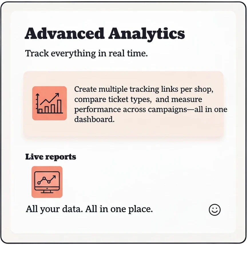 Create multiple tracking links per shop, compare ticket types, and measure performance across campaigns, all in one dashboard.