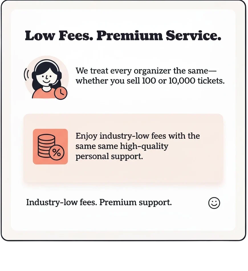 Enjoy top-tier support and tools without the high price tag. At Ticksz, every organizer gets the same level of care. No matter the event size.