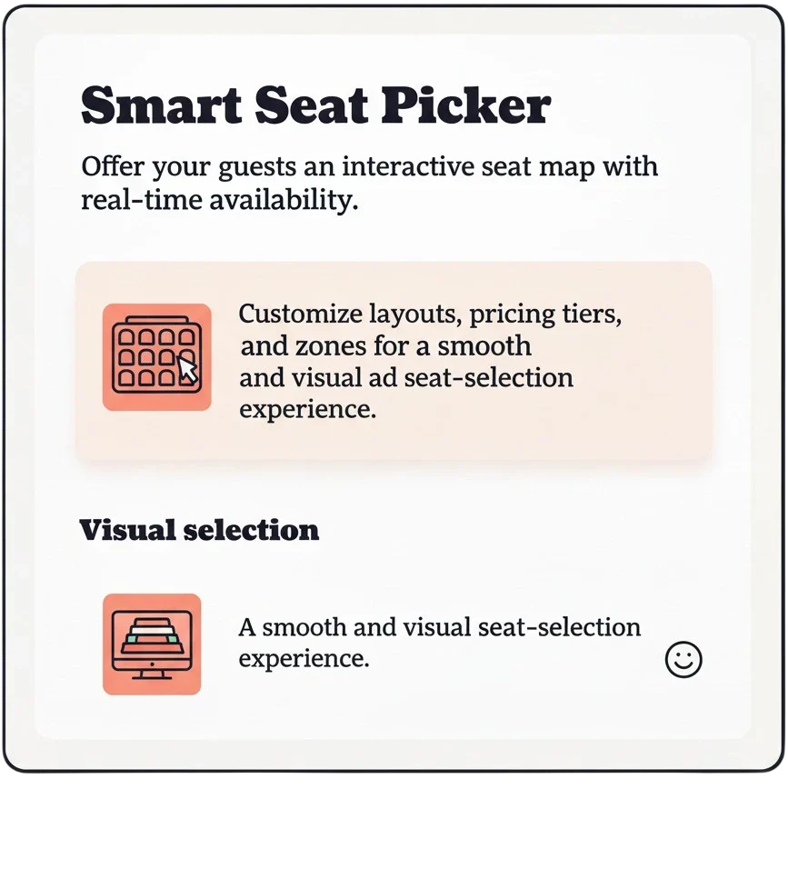 Give your guests a fast, visual, and intuitive way to choose their seats. Customize everything to match your venue and pricing strategy.